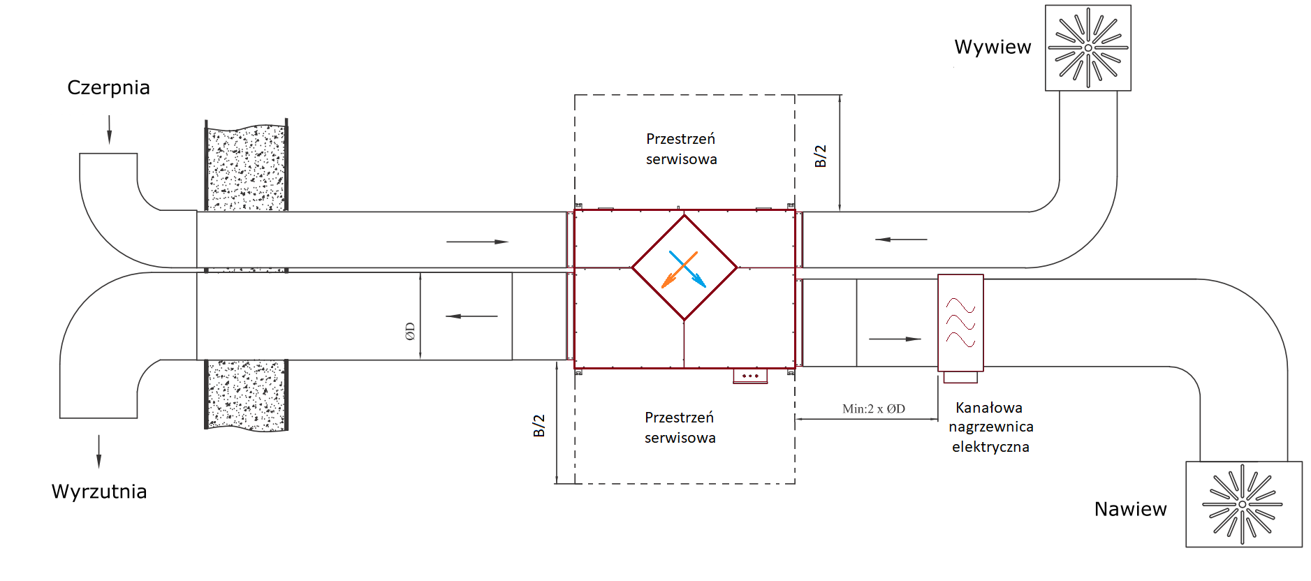 Rekuperator przeznaczony jest do montażu w pozycji poziomej, najczęściej podwieszany jest w przestrzeniach podstropowych.