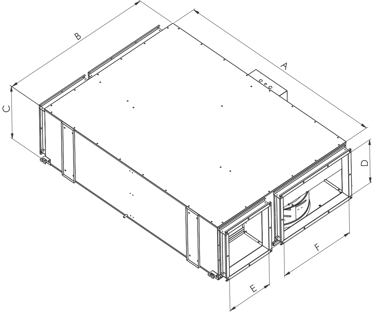 Wymiary [mm]: Długość A=1500 Szerokość B=1200 Wysokość C=415 Kanał wlotowy DxE=320x400 Kanał wylotowy DxF=320x555 |
