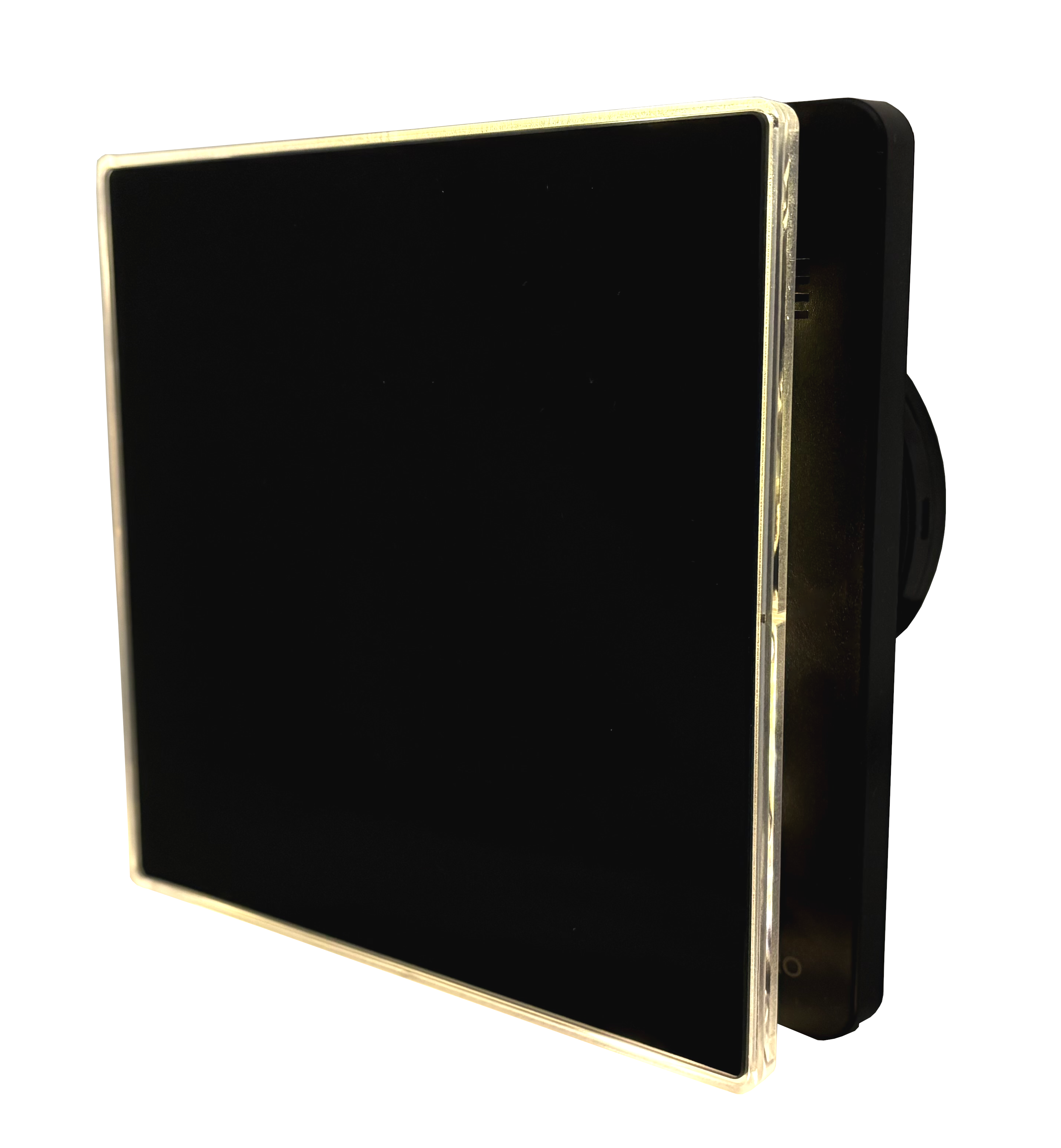 Wentylator łazienkowy HOKURO HOK w eleganckim czarnym kolorze, z panelem szklanym i podświetleniem LED. Dzięki minimalistycznemu designowi doskonale komponuje się z wnętrzami o nowoczesnym i industrialnym charakterze.
