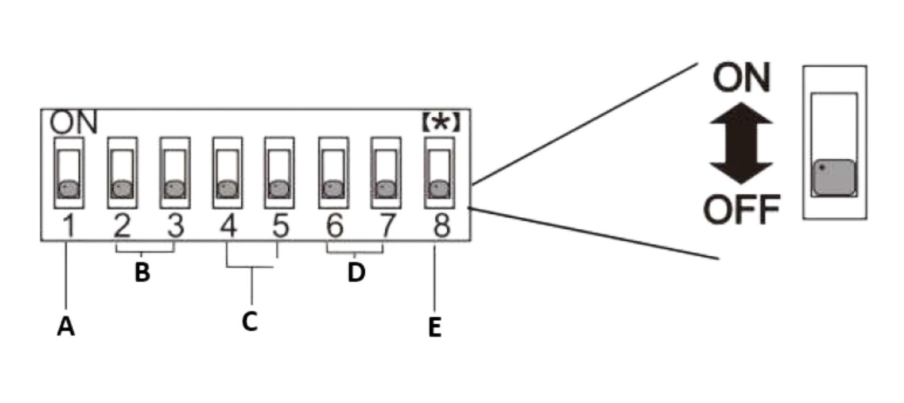 Pożądany poziom wilgotności i czas działania wybiera się za pomocą 8 przełączników DIP. Każdy przełącznik typu dipswitch ma dwie pozycje ON(1) i OFF(0).