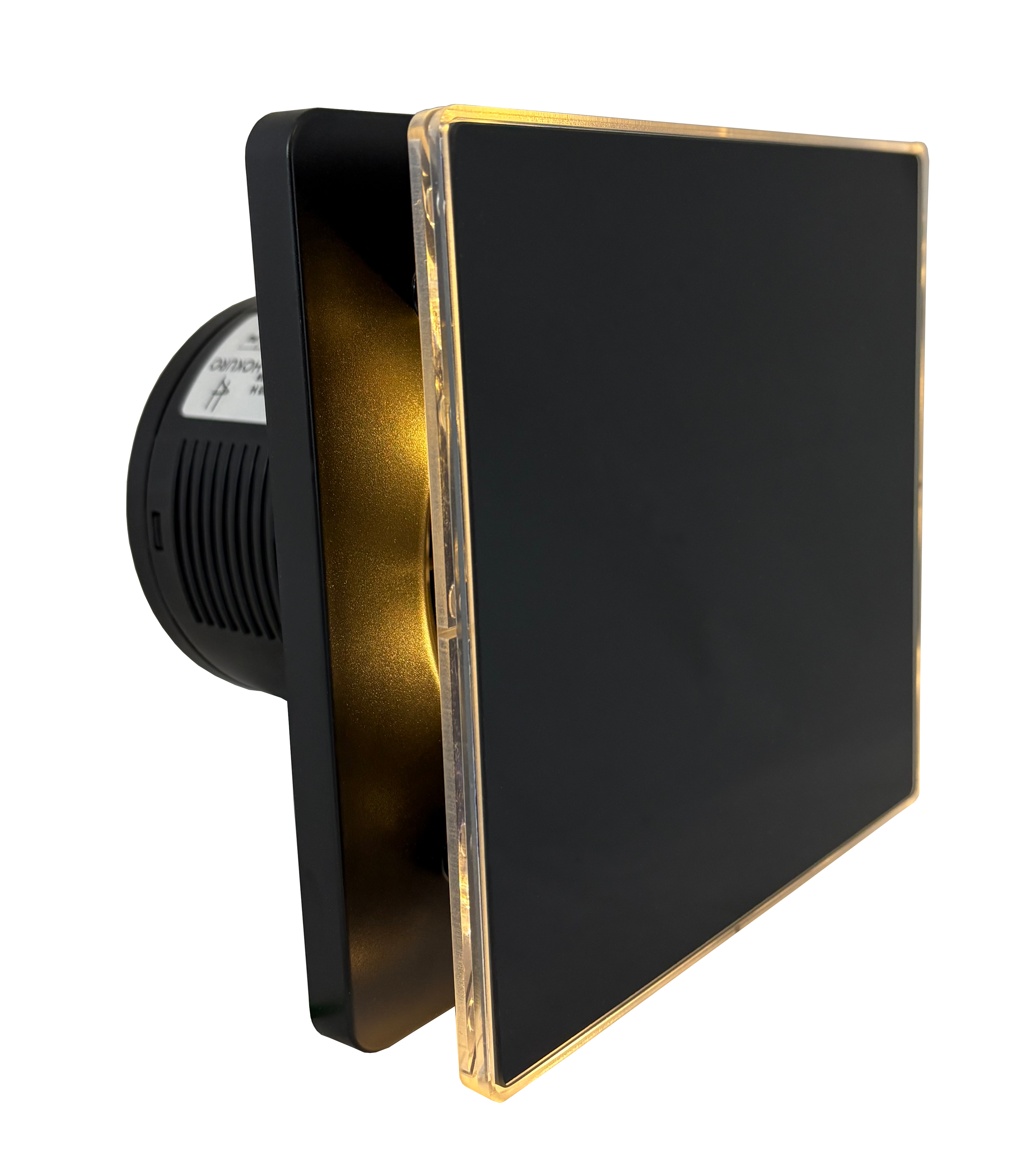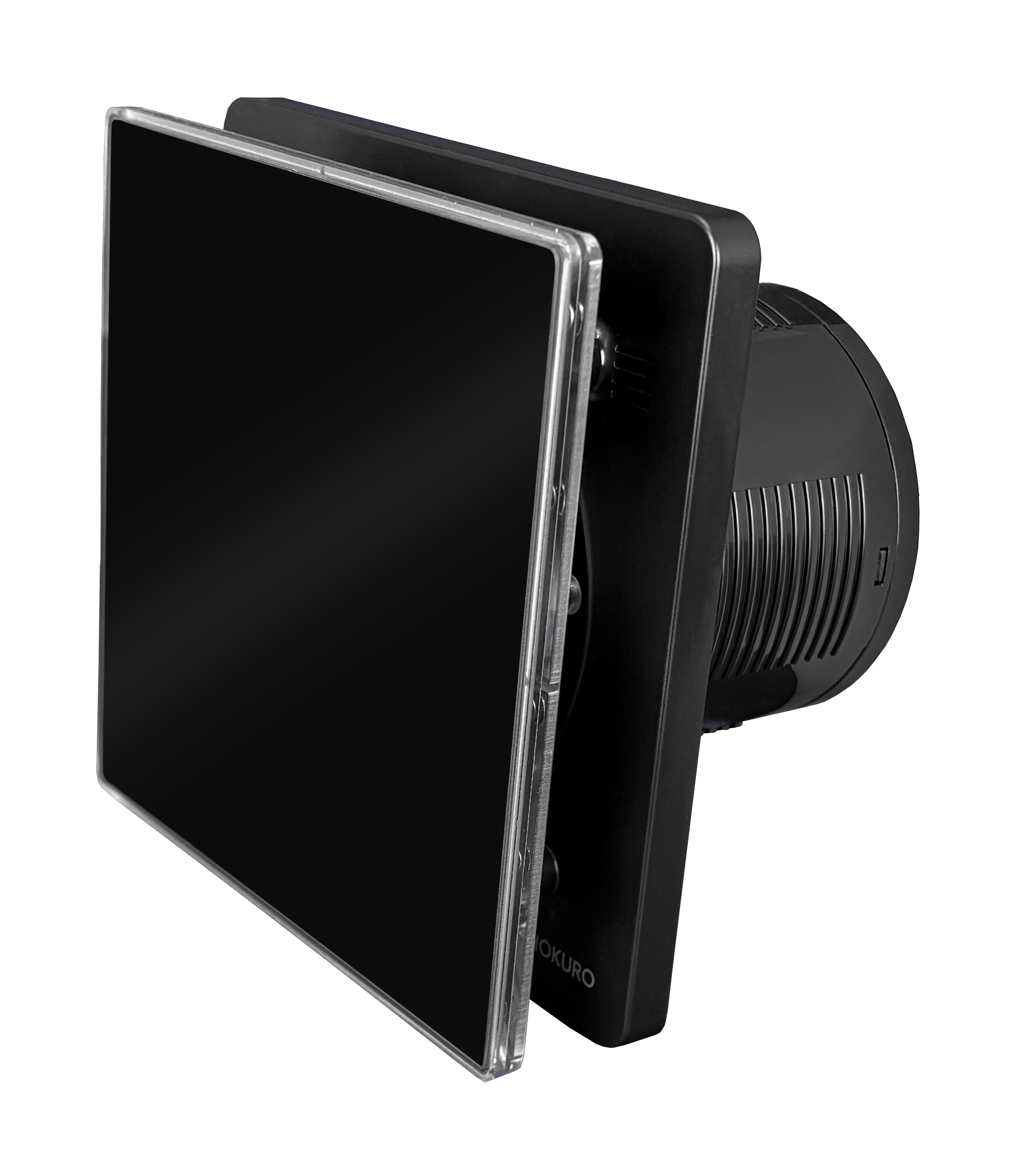 Wentylator łazienkowy HOKURO HOK w eleganckim czarnym kolorze, z panelem szklanym i podświetleniem LED. Dzięki minimalistycznemu designowi doskonale komponuje się z wnętrzami o nowoczesnym i industrialnym charakterze.