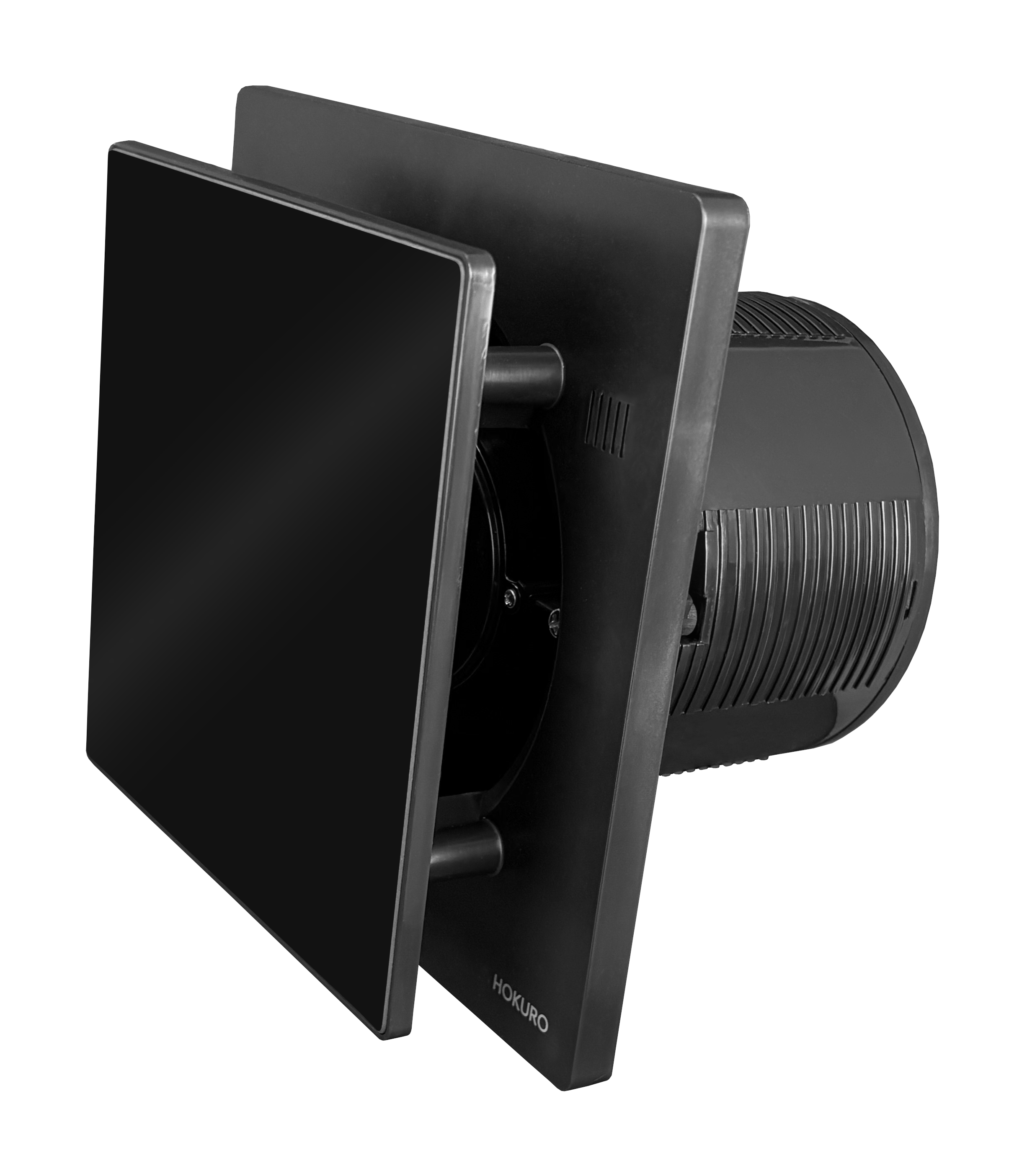 Wentylator łazienkowy HOKURO HOK w eleganckim czarnym kolorze, z panelem szklanym. Dzięki minimalistycznemu designowi doskonale komponuje się z wnętrzami o nowoczesnym i industrialnym charakterze.