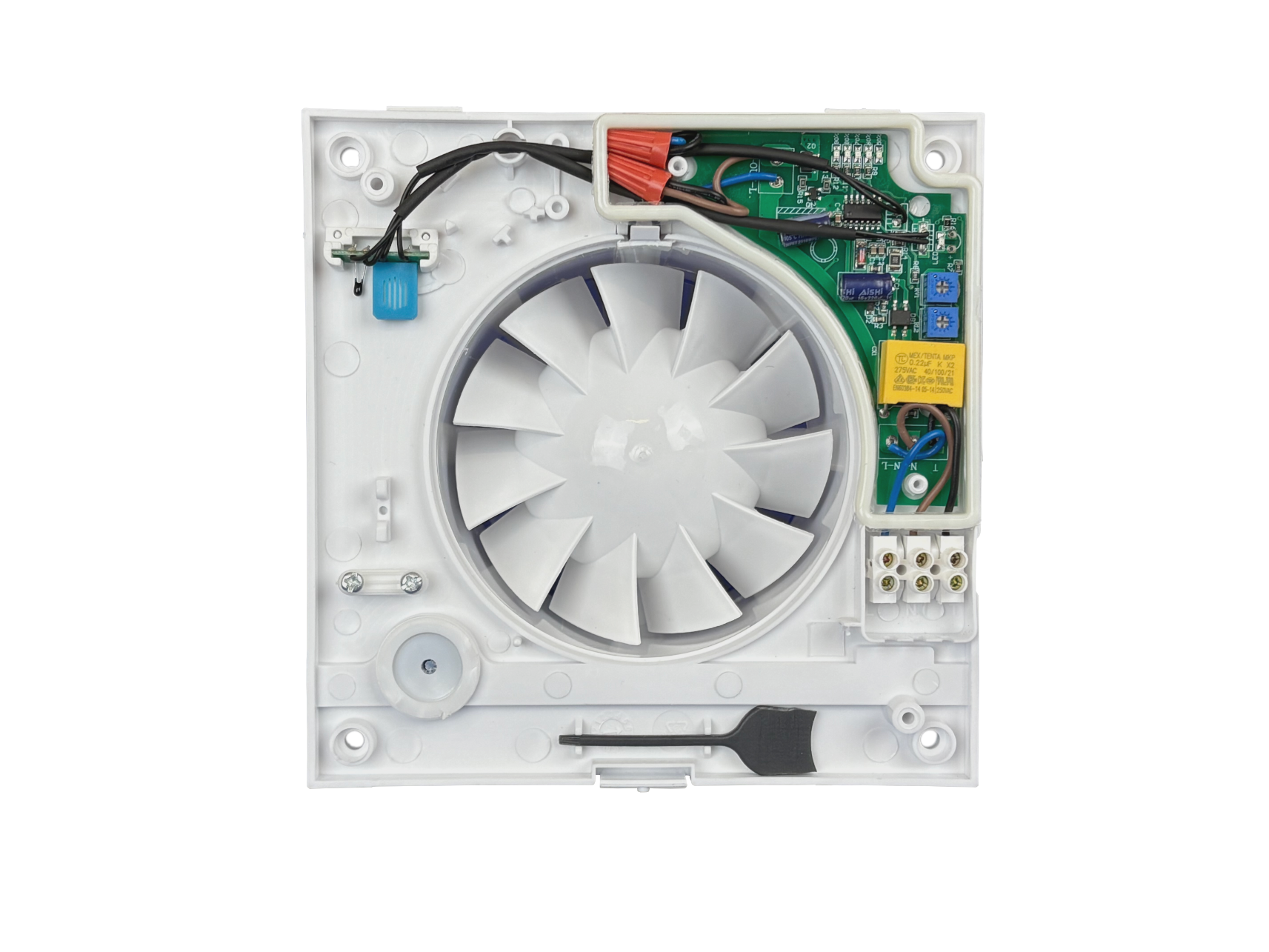 Higrostat uruchomi wentylator automatycznie, gdy poziom wilgotności w pomieszczeniu będzie wyższy, niż ustawiony za pomocą przełącznika. Wentylator zatrzyma się, gdy wilgotność spadnie o 3% poniżej nastawy, oraz po upływie nastawionego czasu działania opźnienia.